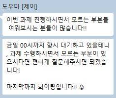 무엇보다 좋았던 점은, 어떤 질문을 하든 성심껏 답변해주신 점과 공부가 늘어질 때마다 도우미 제이님이 옆에서 다시 동기를 불어넣어 주셨던 점이었습니다. 덕분에 “혼자 하는 공부”가 아니라 함께 성장하는 “팀 공부”라는 느낌을 강하게 받을 수 있었습니다.